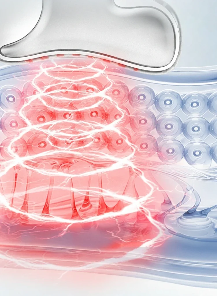 The MC current reaches 5mm beneath the skin, activates collagen regeneration, tightens and sculpts the contour, smooths fine lines, and eliminates edema.